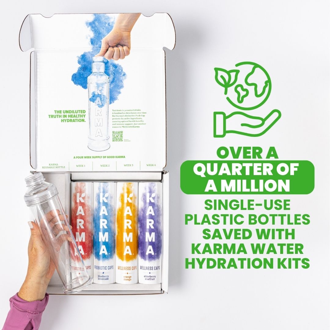 At Karma Water, we believe every small action counts in the global effort toward creating a more sustainable world, and we are committed to working toward a cleaner planet. We recognize the responsibility that comes with our product, and that's why in 2023 we proudly introduced our Hydration Kits. This initiative supports our ongoing commitment to shrink our plastic footprint and provide more eco-friendly options for Karma Water enthusiasts. Pair your favorite Karma Push Caps with our reusable bottle when you build a custom Hydration Kit.