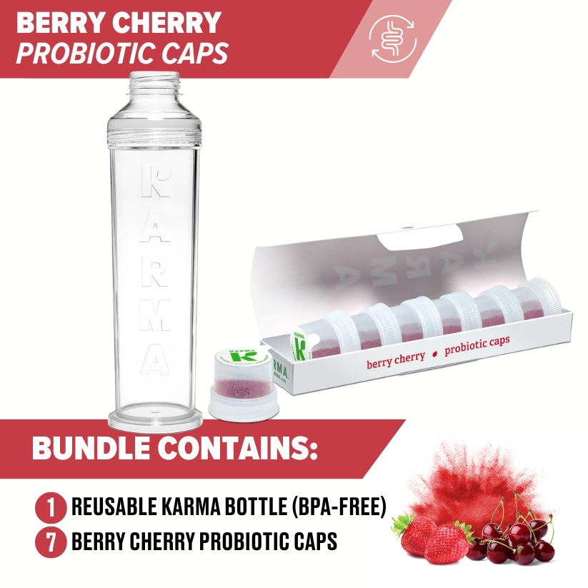 - 7 Karma PushCaps: Choose one of the most popular flavors from our Probiotic or Energy. Karma’s patented Push Cap protects the active ingredients until the minute you’re ready to drink – guaranteeing you’ll receive the highest level of nutritional benefits!